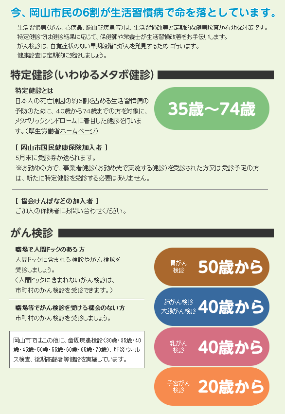 健康診査には、生活習慣病予防のための特定健診と肝炎ウイルス検査、胃がん、肺がん、大腸がん、子宮がん、乳がん検診があります。